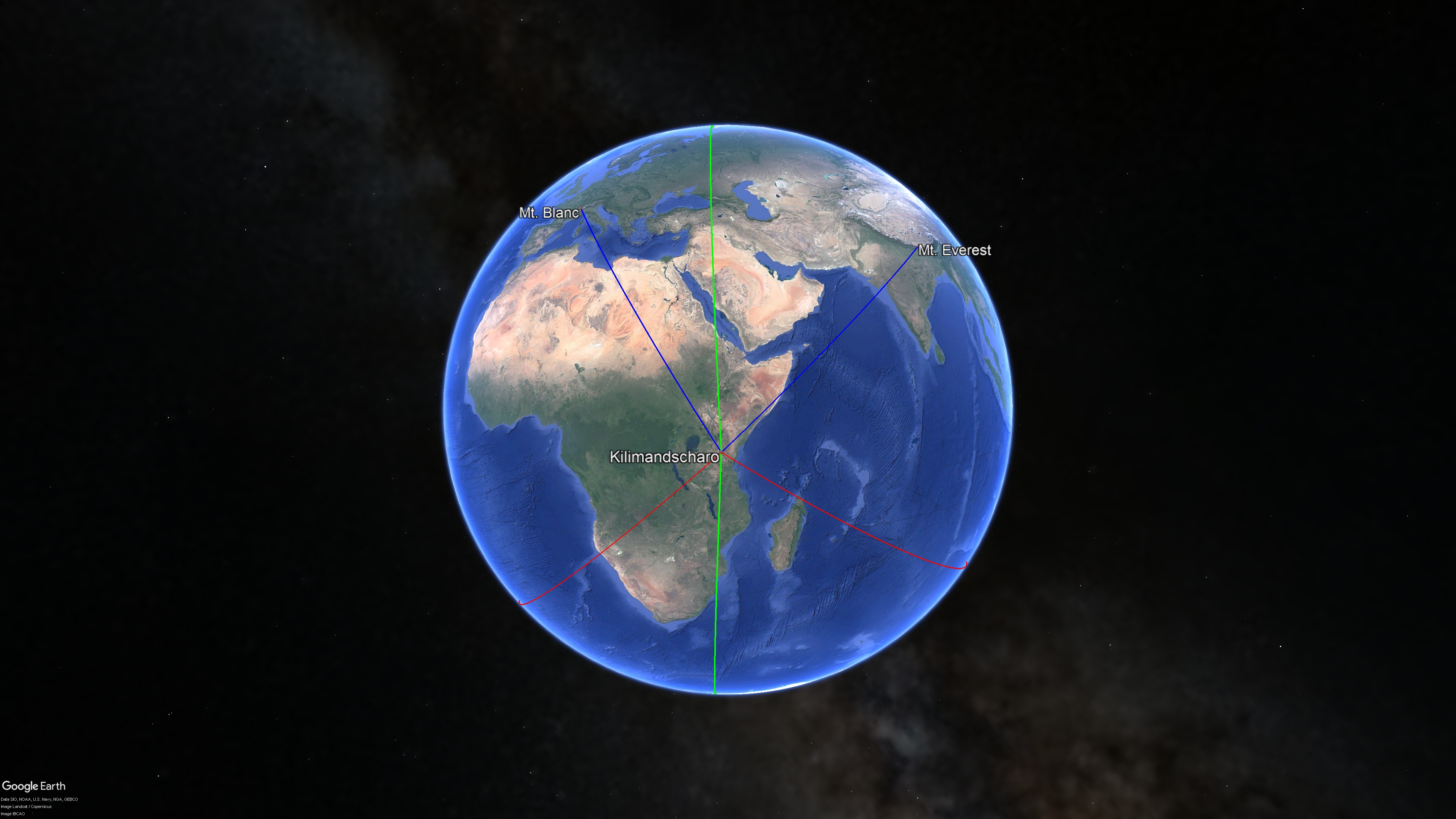 Nimmt man die drei anderen Berge, den Mt. Blanc, den Mt. Everest und das Vinsonmassiv hinzu, wird die Symmetrie des Erdenantlitzes und das Herausragen des Kilimandscharos darin noch deutlicher. Diese Berge zählen nicht zum Sphärischen Erdentetraeder, stehen aber zu ihm in engem Bezug, und zwar gerade über den Kilimandscharo. Die beiden von diesen drei Bergen, die sich auf der Nordhalbkugel befinden, der Mt. Blanc und der Mt. Everest, haben den nahezu gleichen Abstand zu ihm (Abb.7):