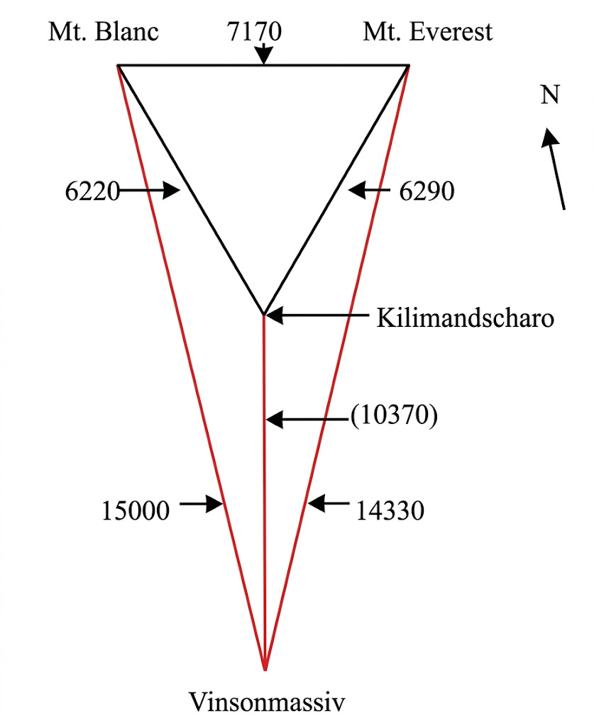 Auch das Vinsonmassiv fügt sich quantitativ und qualitativ in das Erdenantlitz. Die Entfernungen Vinsonmassiv - Mt. Blanc mit \( 15000 \, \mathrm{km} \) und Vinsonmassiv - Mt. Everest mit \( 14330 \, \mathrm{km} \) liegen nahe beieinander und sind jeweils gerade (etwa) das Doppelte der Entfernung Mt. Blanc - Mt. Everest mit \( 7170 \, \mathrm{km} \) (Abb. 8 und9).