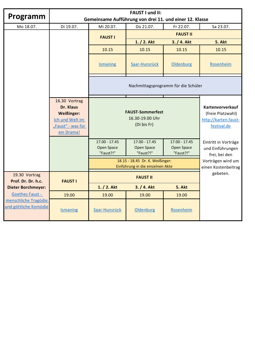 12. Klassen von sechs Waldorfschulen aus ganz Deutschland spielten jeweils einen der Parts des Monumentalwerks (FAUST I und die fünf Akte des FAUST II) und führten ihn in dem großen Festsaal der Rudolf-Steiner-Schule Ismaning an direkt aufeinander folgenden Tagen zwei Mal auf. Einmal abends für die Öffentlichkeit und einmal vormittags ebenfalls für die Öffentlichkeit, aber auch für Schulklassen.