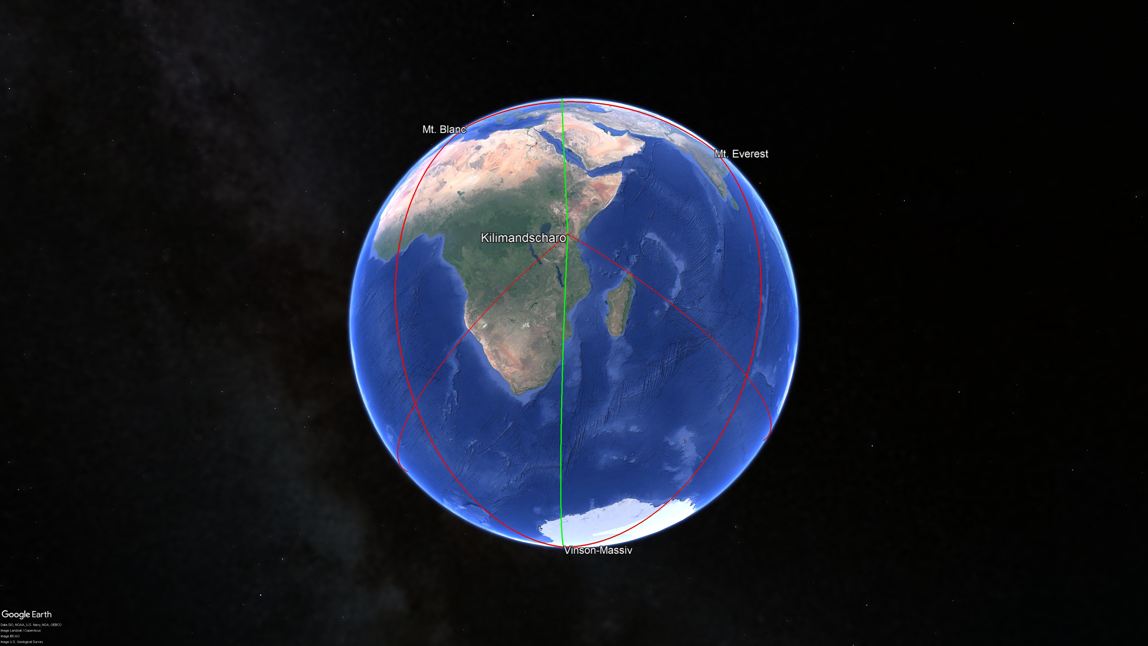 Nimmt man die drei anderen Berge, den Mt. Blanc, den Mt. Everest und das Vinsonmassiv hinzu, wird die Symmetrie des Erdenantlitzes und das Herausragen des Kilimandscharos darin noch deutlicher. Diese Berge zählen nicht zum Sphärischen Erdentetraeder, stehen aber zu ihm in engem Bezug, und zwar gerade über den Kilimandscharo. Die beiden von diesen drei Bergen, die sich auf der Nordhalbkugel befinden, der Mt. Blanc und der Mt. Everest, haben den nahezu gleichen Abstand zu ihm (Abb.7):